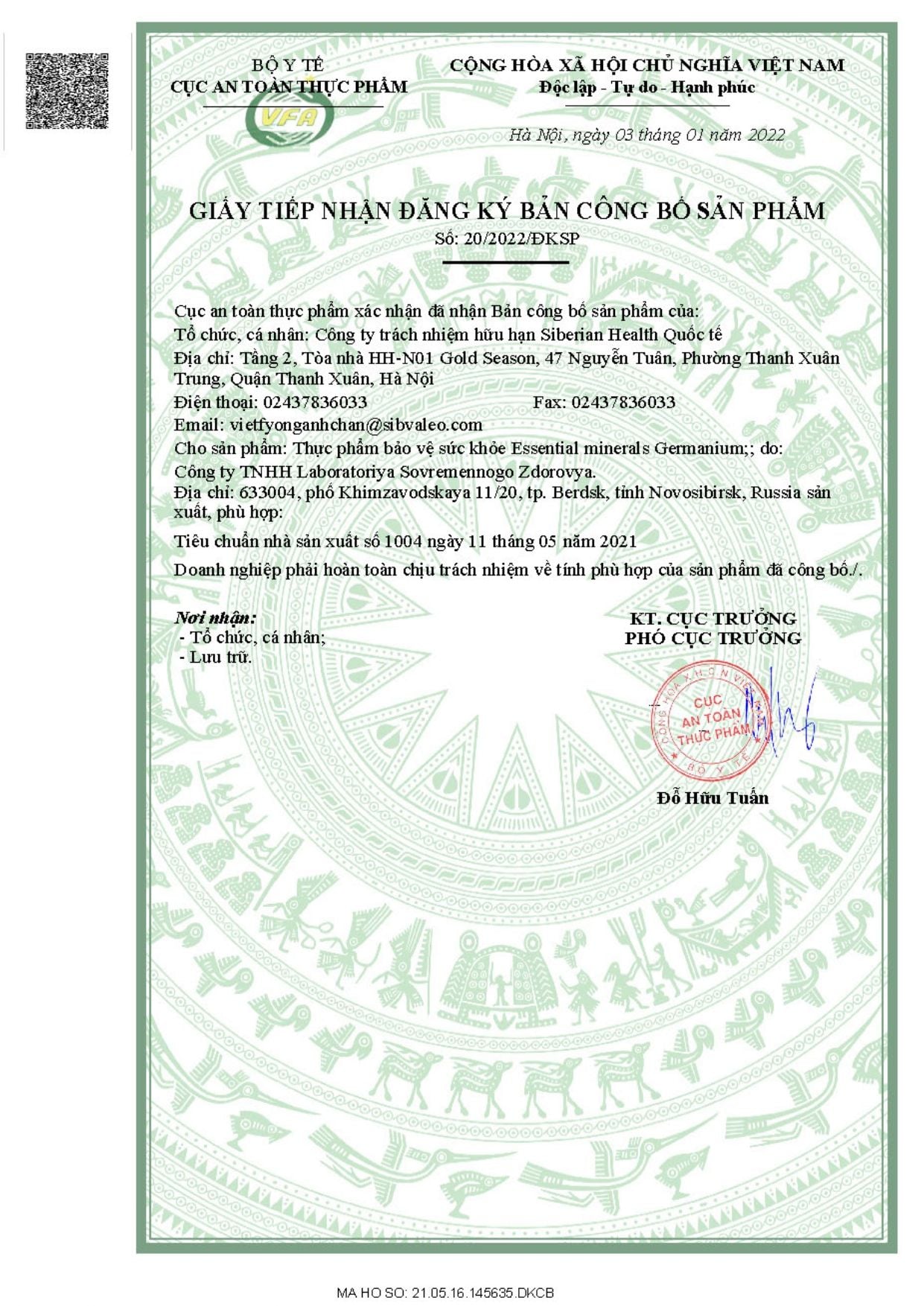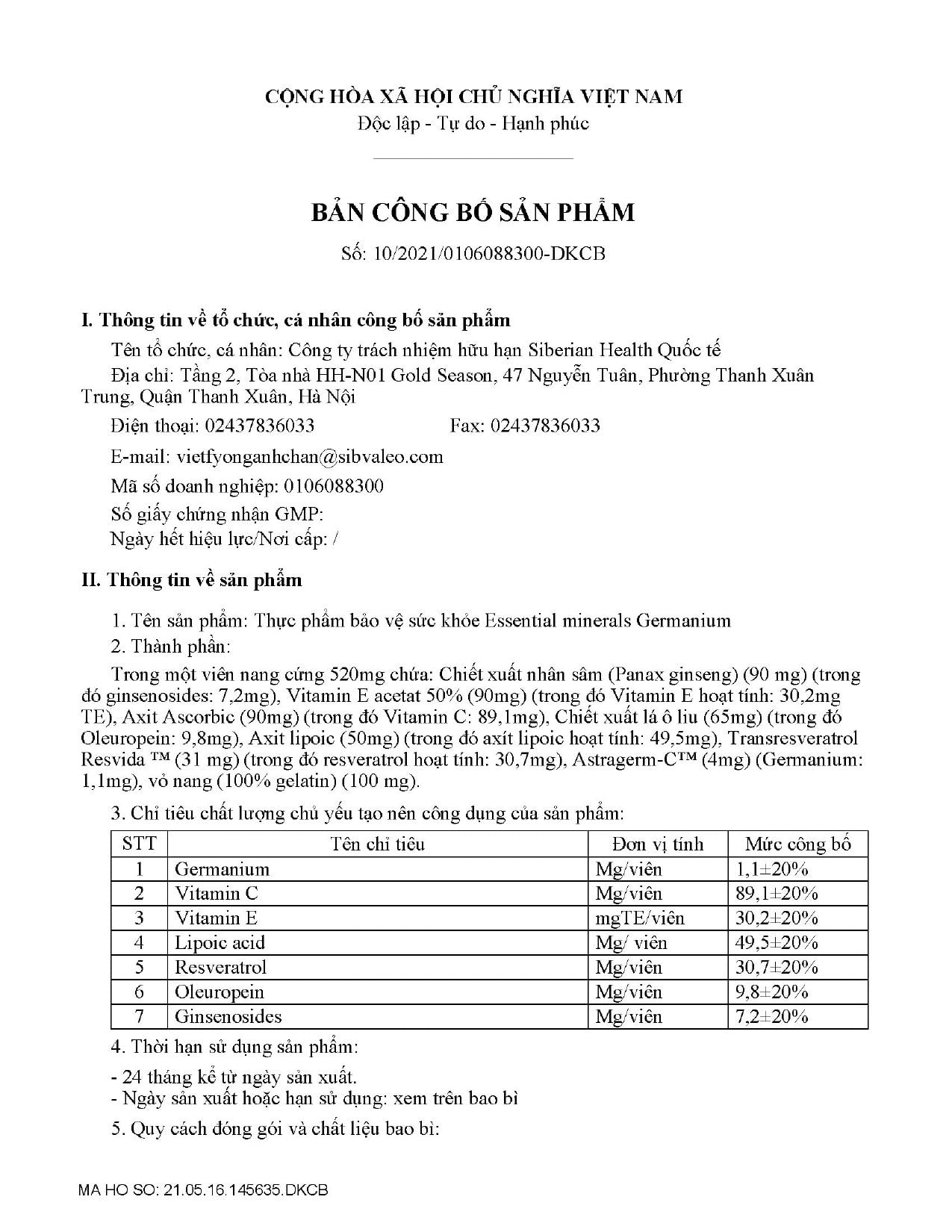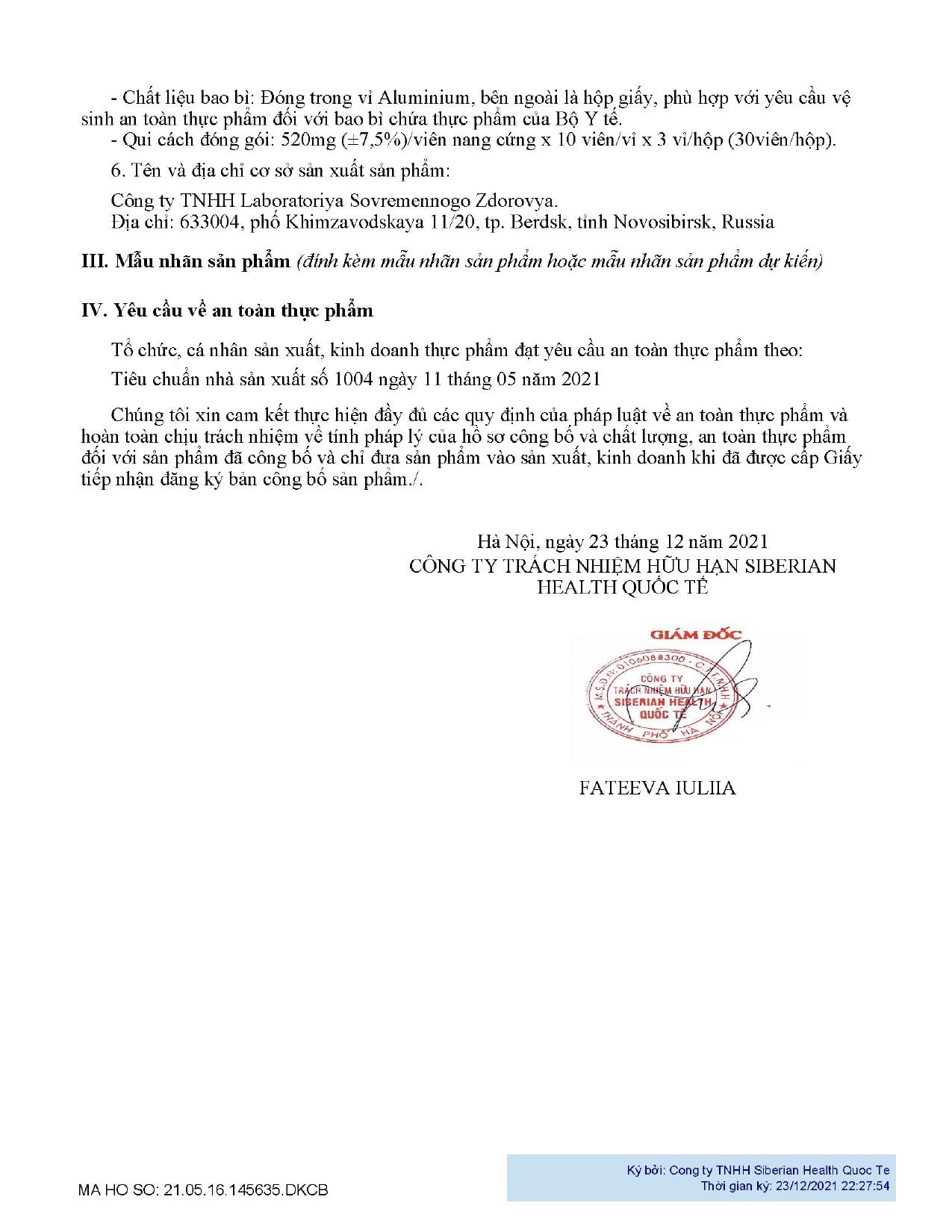 Thương nhân nhập khẩu và chịu trách nhiệm về chất lượng sản phẩm: CÔNG TY TNHH SIBERIAN HEALTH QUỐC TẾ