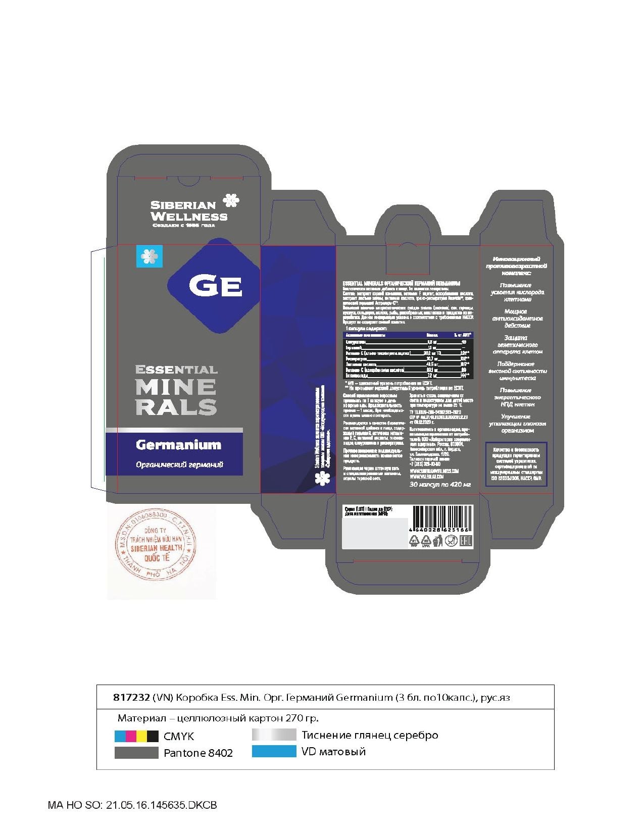 Phức hợp độc đáo với germanium hữu cơ, resveratrol và chất chống oxy hóa tự nhiên có tác dụng chống lão hóa rõ rệt, trẻ hóa toàn diện cơ thể, làm chậm quá trình lão hóa và cung cấp oxy đến các mô.