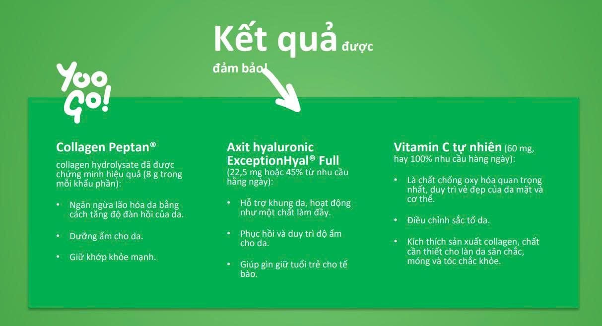 Sản phẩm được các nhà khoa học Nga nghiên cứu tạo ra hàm lượng 10.000 mg Collagen Peptide cùng tổ hợp các vitamin C tự nhiên có trong nhóm quả mọng với những chất chống oxy hóa tốt nhất (quả mâm xôi, quả việt quất, dâu tây, phúc bồn tử đen) lý tưởng để cơ thể hấp thu trọn vẹn mỗi ngày. Từ đó Collagen thủy phân Yoo Go Young & Beauty Drink Mix có thể được sử dụng liên tục giúp da đẹp vừa khỏe mạnh cho cơ thể, không cần thời gian nghỉ.